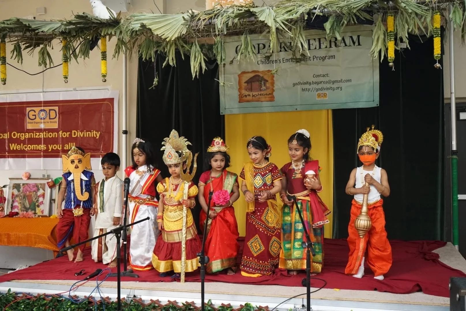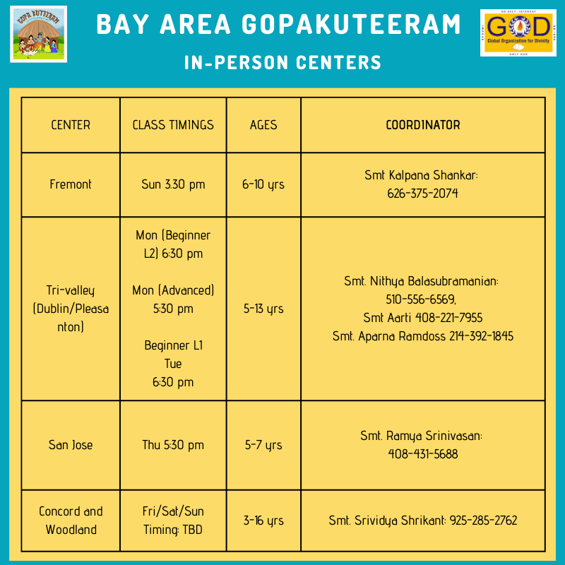 Started in 2011, California Gopa Kuteeram is now entering its 15th year of nurturing spiritual and cultural values in children aged 4 to 14. Alongside regular classes, we offer three vibrant clubs—Sloka, Sampradaya Bhajans, and Hari Katha—that deepen learning and devotion. Students regularly present at satsangs and local temples, offering their Slokas, Bhajans, and Kathas to Bhagavan.
