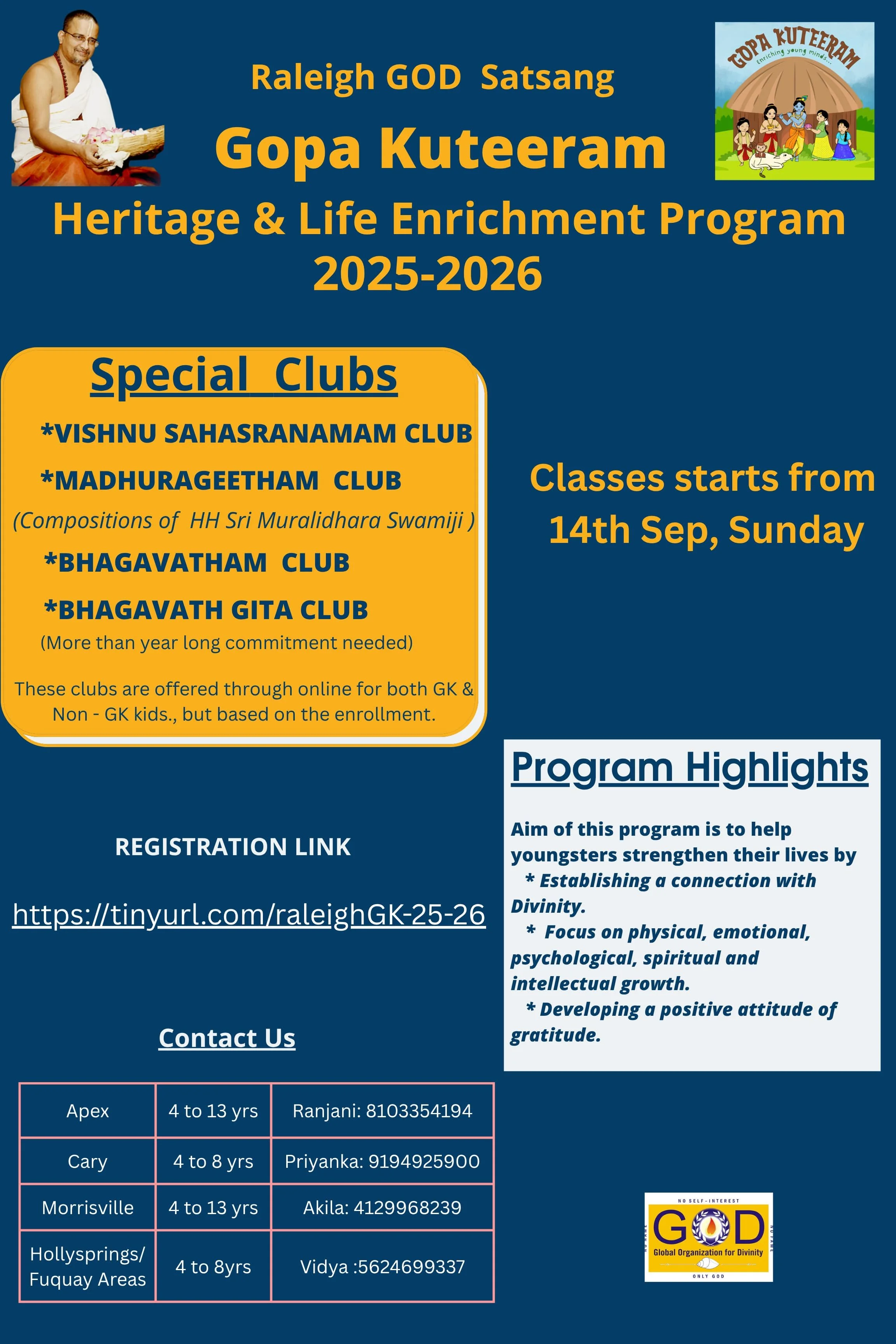 Raleigh’s Gopakuteeram (GK) program has been running since 2012, engaging children aged 4–13 through creative, in-person sessions featuring skits, stories, games, and multimedia. Many parents are active satsang members and volunteer as teachers, fostering a strong community spirit.